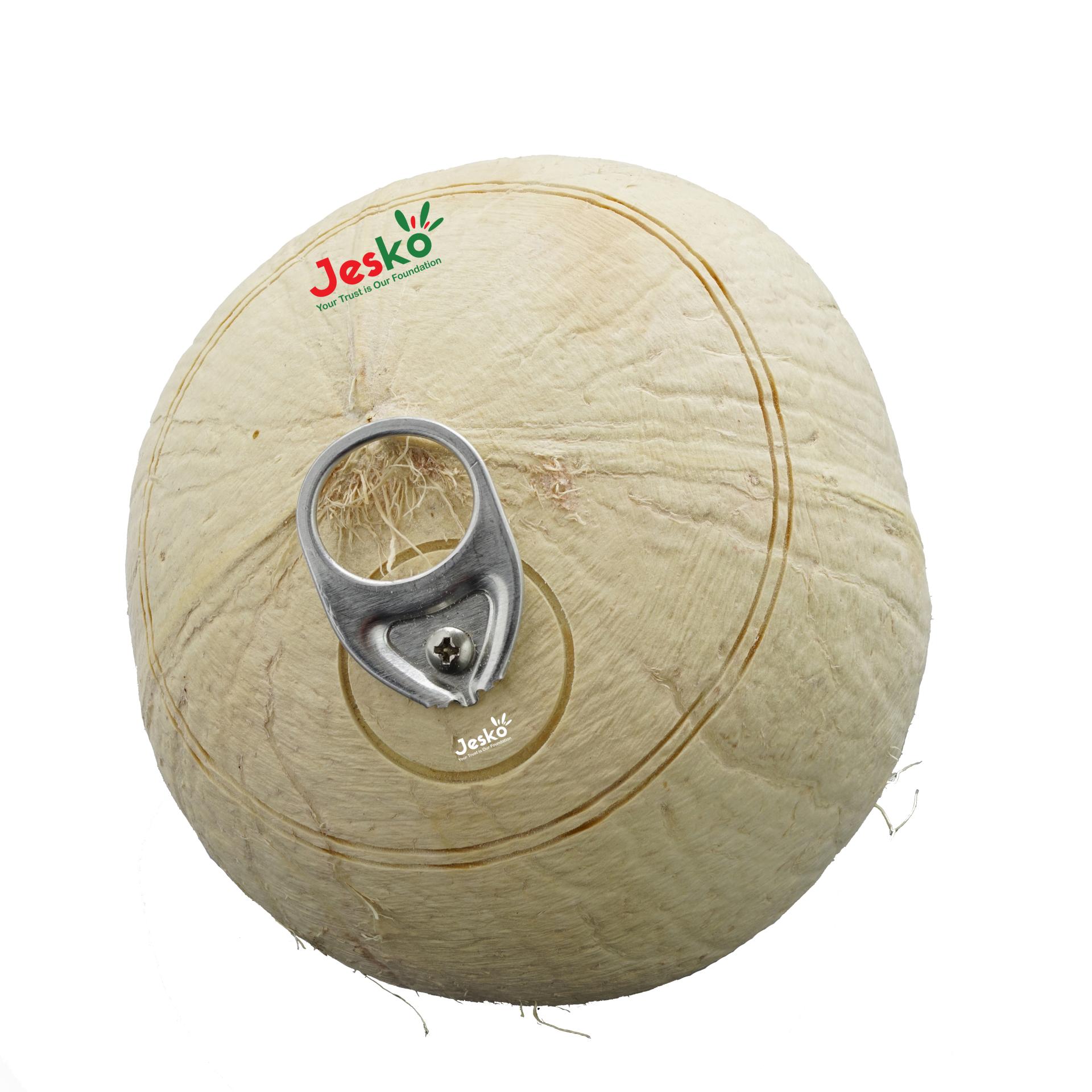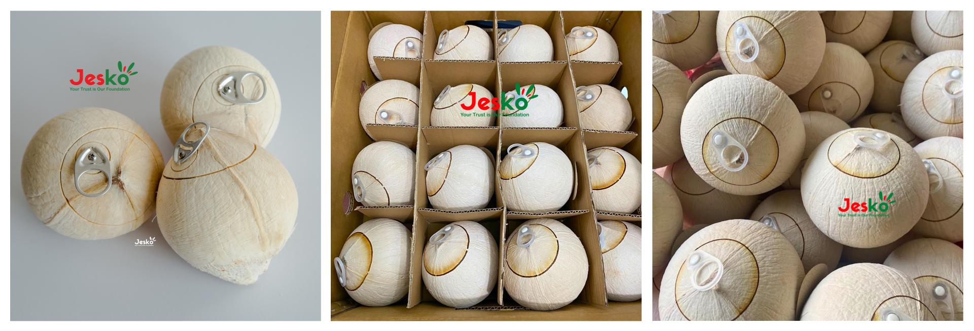 Jesko premium ring-pull young coconuts from Ben Tre, Vietnam. Fully trimmed, easy-open cap, 100% natural. 45–50-day shelf life. 9-12-16-32 pcs/carton, 40ft RF container load. OEM/private label. Payment: TT or LC at sight